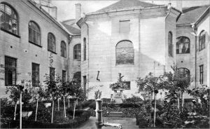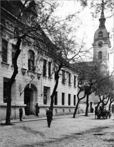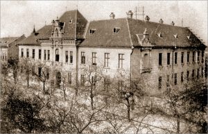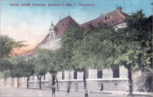 Према нацрту архитекти Ђуле Партоша и Едена Лехнера, овде је 1887. г. саграђена једноспратница у стилу еклектицизма, са основом у облику неправилног слова Е. Трошкови изградње, без трошкова опремања овог здања, износили су 62.551 форинти. Сомборци су је, по калуђерицама које су овде биле смештене, назвали „Апација“.Р